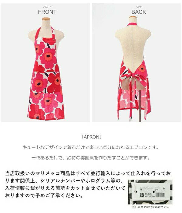 商品名マリメッコ エプロンMARIMEKKO APRONピエニウニッコダークレッド並行輸入品 64161 63371 67316 67798 69907 69902 69989 69027 67727 70318 70189 69611 69680 69705サイズ採寸単位(cm) 着丈 身幅フリー 84 83品番商品説明フィンランド語で「小さなマリーのためのドレス」という意味のマリメッコは、独創的なプリントと色遣いで知られる、フィンランドのデザインをベースにしたライフスタイルブランドです。